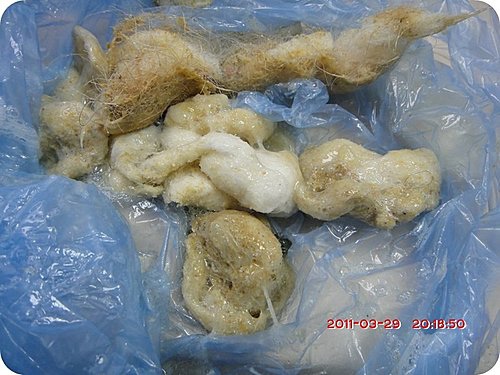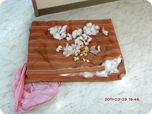 圖片裡面可以看到有些棉絮是已經被妮妮吞下去過又吐出來的,
