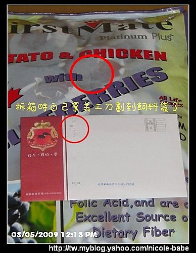 原本一如往常要來跟飼料拍個合照~ 但發生了一個慘劇~ 那就是我用美工刀割壞了外袋了