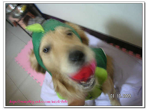帽子戴上去還有兩個洞可以把耳朵放在外面~ 應該是設計給立耳的狗狗的啦