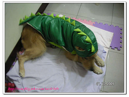 畫面很模糊吧~ 不是我的手在抖~是因為我家女兒不知為何恐龍裝一穿就high了~