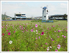 視野寬廣的開放空間。座落在台四線上,以藍白主建物為中心向周圍呈放射狀環繞的廣大腹地,有用心栽種的綠意草皮及花圃、有在草皮上標立的二座風車,也築有縮小版的地中海風建物,供民眾玩耍、拍照。餐廳內的大片落地窗,更是讓窗外景色盡收眼底。