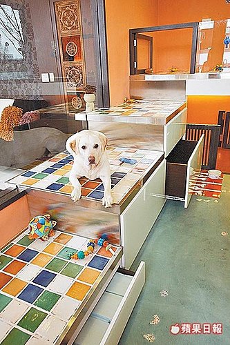 主人使用的空間已偏暗色系,所以在狗狗的房間裡,以橘色為主,提升室內的溫馨與明亮度。擔心顏色會過於單調,於是在階梯表面,搭配鮮亮色系的拼貼磁磚,一掃空間暗沉,家也變得更繽紛,就算狗兒在上面大小便,屋主也很好清理。