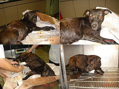 【丁治綱╱高雄報導】高雄縣岡山鎮五名外勞趁放颱風假虐狗,他們先驅趕一隻懷孕的母黑狗至工地內,再以木棍將母狗打得頭破血流,聲響驚動看守工地的人員,報警將外勞趕走,而重傷、恐失明的母狗倒臥風雨中,經緊急送往動物醫院救治,生命跡象恢復穩定,腹中六隻小狗也幸運存活。